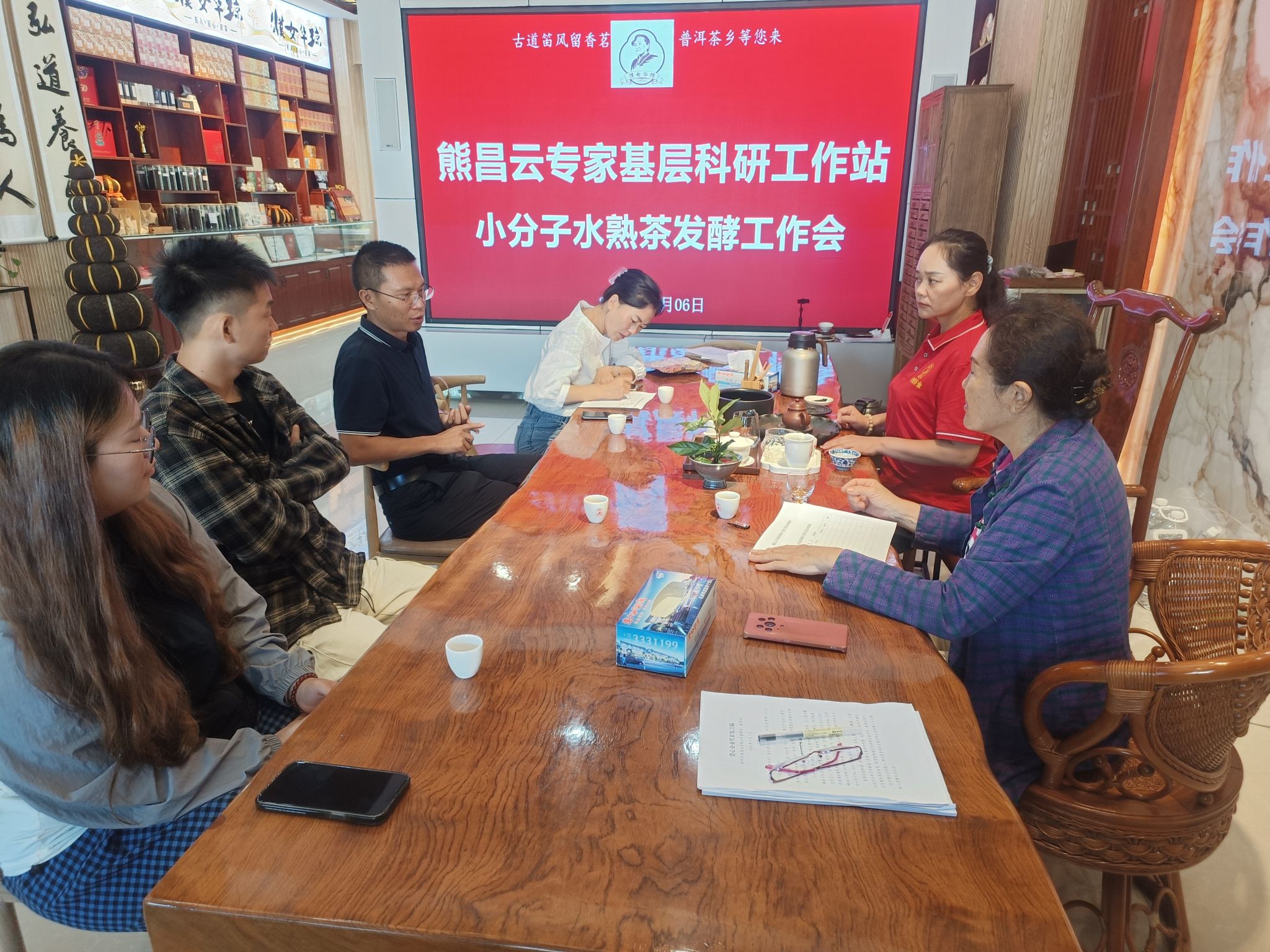 科技服务团队联合云南天士力帝泊洱生物茶集团有限公司、滇西应用技术大学普洱茶公司、普洱市职业教育中心等教师及科技人员,依托云南省委组织部熊昌云专家基层科研工作站科研平台共同对普洱华煜茶业有限公司开展的小分子水发酵普洱熟茶工艺进行了深入探讨,并提出了相应的意见和建议。