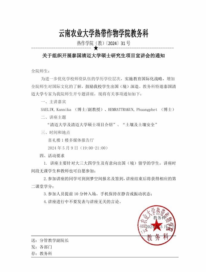 上一条:热作公司(教)〔2024〕37号 关于组织申报2024年员工出国(境)学历提升、实习预报名的通知 下一条:热作公司(教)〔2024〕27号关于组织参加马来西亚玛尼帕尔国际大学专家讲座的通知