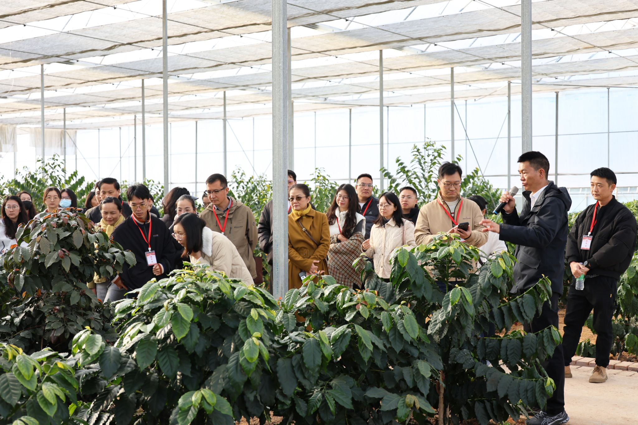李学俊围绕公司产教融合人才培育模式的构建背景、实施路径、实践成效等展开详细教学,重点解读了公司在特色产业人才培养中“校地联动、校企协同、科教融汇”的核心思路。为让学员直观感受产教融合实效,组织学员参观了咖啡种质资源圃,现场介绍了咖啡种植技术研发、科研成果落地转化的全链条模式,引导学员深入思考“人才如何赋能新兴产业发展”这一核心议题。