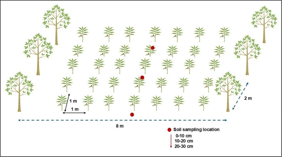 红点代表行中取样点(距离橡胶树行4米);土壤分层深度为0–10 cm、10–20 cm、20–30 cm;每个深度×种植模式组合的重复数 n = 3