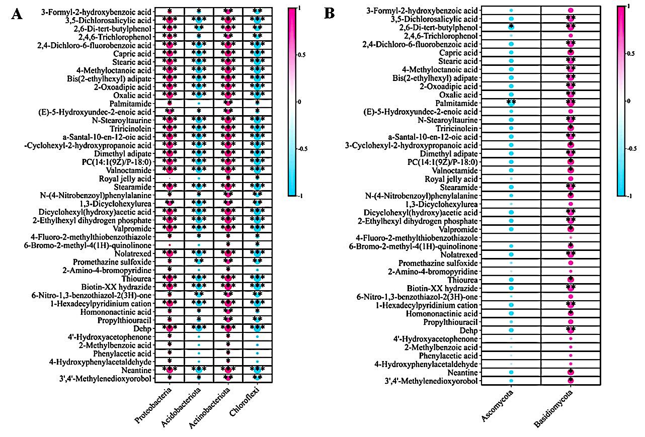 (A)45 种根际代谢物与根际4个优势细菌菌门的相关性;(B)45 种根际代谢物与根际2个优势真菌菌门的相关性