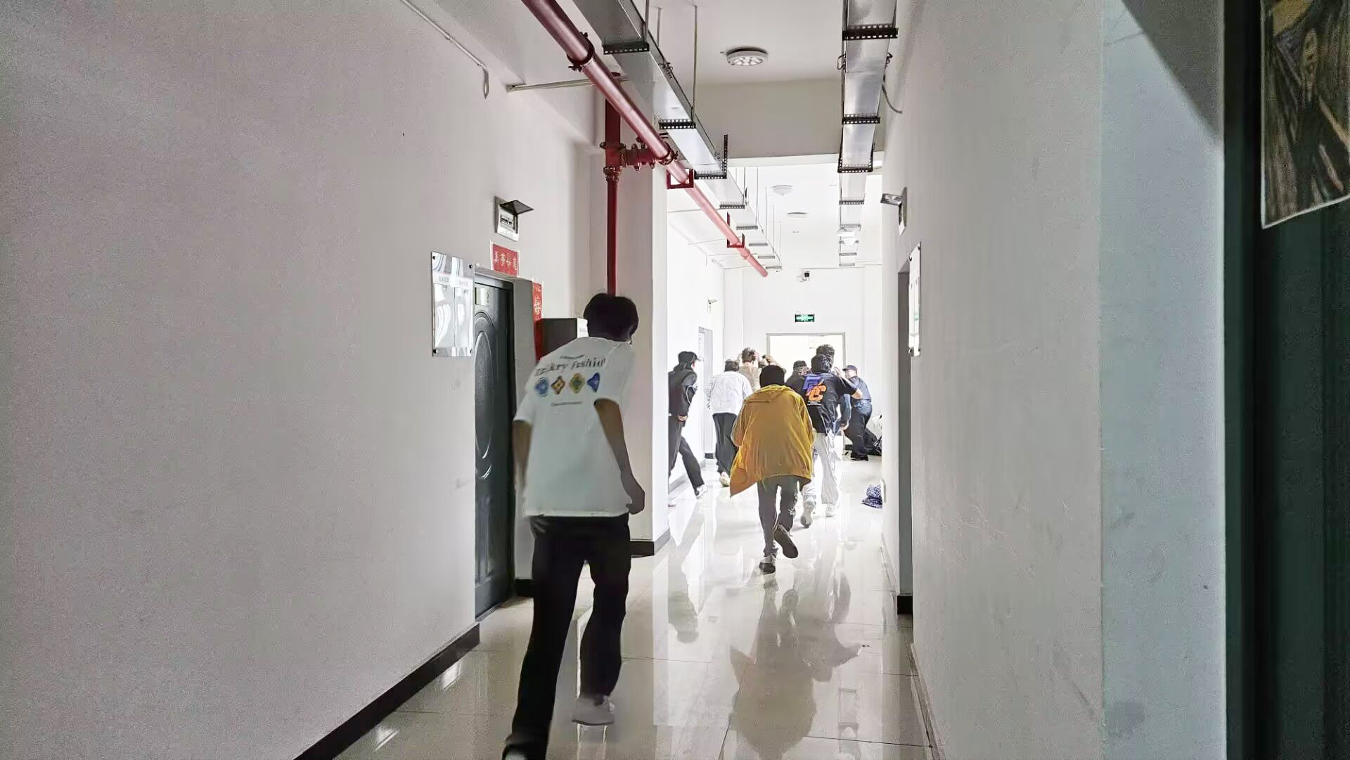 随着警报声响起,演练正式拉开序幕。在各楼栋楼层安全员的引导下,同学们迅速反应,按照“伏地、遮挡、手抓牢”的避险原则进行紧急就地避震。随后,在疏散指令下达后,员工们弯腰、护头,沿着预定的疏散路线快速、有序地撤离至各区域的安全集结地带。整个演练过程紧张有序、忙而不乱,达到了预期效果。