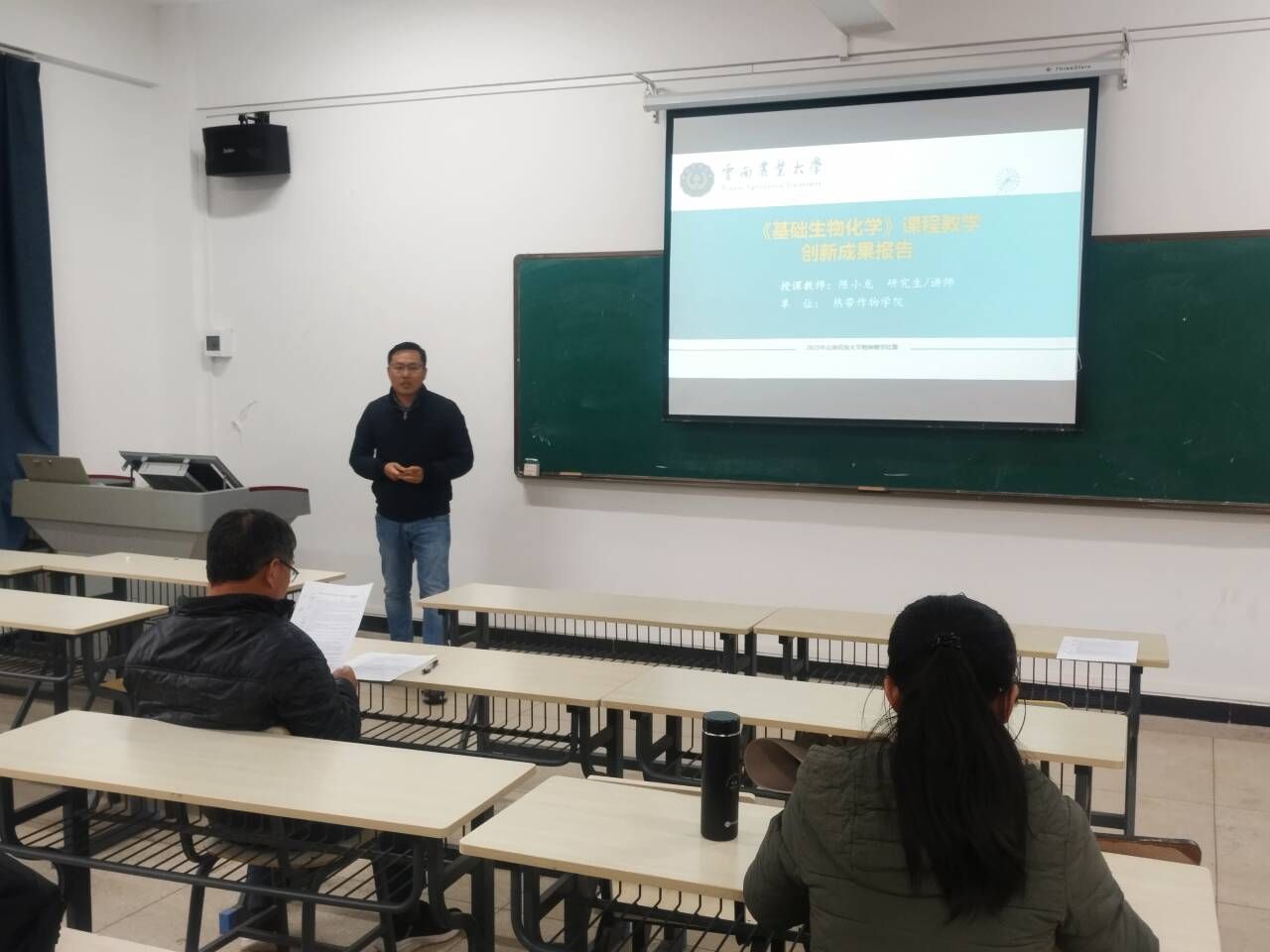 活动伊始,热作系教师党支部书记兼副主任蒋快乐作动员讲话。他强调,参赛教师要以“以赛促教、以赛促改”为目标,通过模拟演练查摆教学短板,优化课程设计,全面提升课程建设质量与教学水平。随后,四位参赛教师依次进行说课展示,分别围绕教学目标、课程思政融入、教学设计创新、信息技术应用及教学成果转化等内容展开阐述。指导专家从教学仪态、内容逻辑、思政元素契合度、技术手段合理性等维度逐一点评,并提出针对性改进建议。