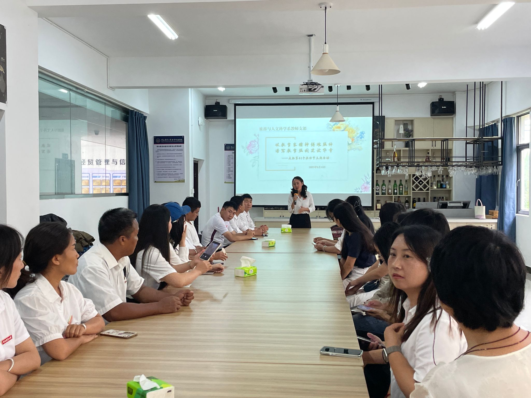 2025年9月10日,旅游与人文科学系举办第41个教师节系列庆祝活动。活动以“以教育家精神铸魂强师、谱写教育强国建设华章”为主题,通过座谈交流、文化体验与互动游戏等,向辛勤付出的教师们致以崇高敬意,进一步凝聚教育理念共识,增强团队向心力。