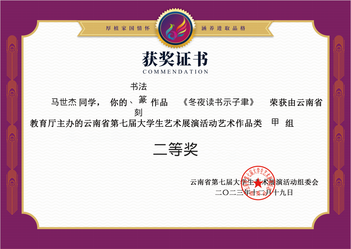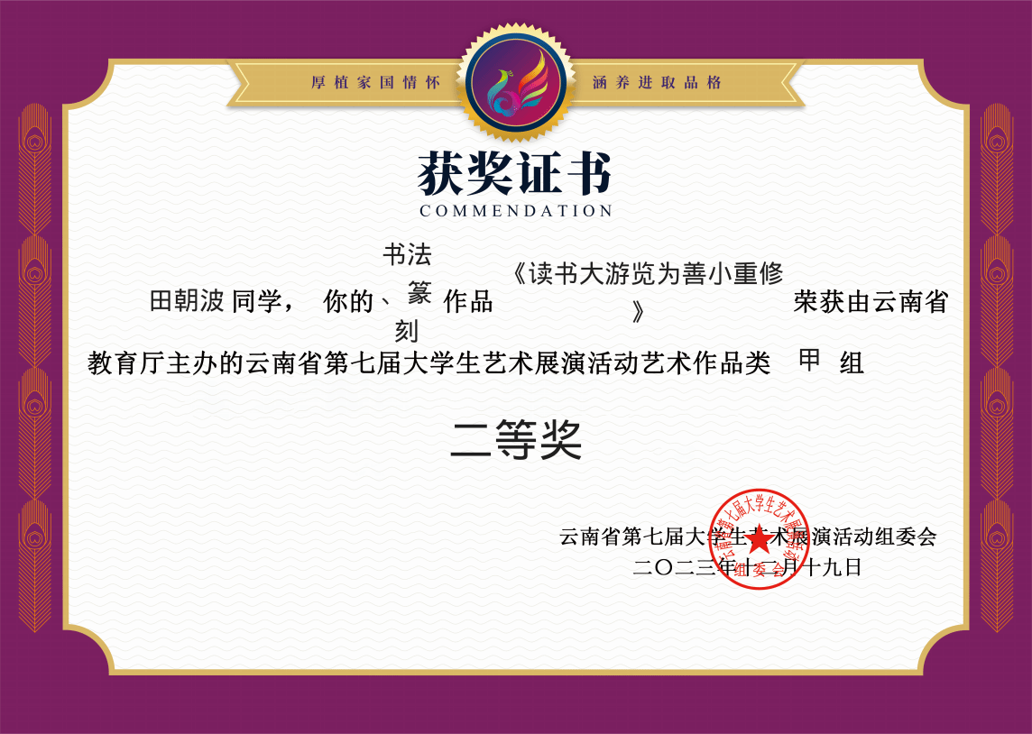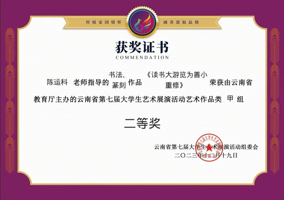 由云南省教育厅主办的第七届老员工艺术展演获奖名单揭晓,公司首次参加赛事创佳绩。据了解,本次赛事共有72所高校参加,共报送艺术表演类节目336个、艺术作品1597幅、美育改革创新优秀案例126篇、艺术工作坊88个。公司在本次赛事中共报送书法作品7幅,其中田朝波和马世杰同学的个人书法作品荣获二等奖,陈运科老师获得指导教师二等奖两项。