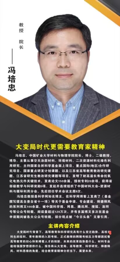 冯培忠教授以“大变局时代更需要教育家精神”为主题,讲述大变局时代背景下高等教育和科学研究的变迁趋势,高校本科生的挂科、青年教师的入职考核,正式教师的聘期考核压力等都困扰着高等教育的初心和束缚着人才的创新,结合未来的改革趋势谈强国梦。此次讲座从大变局、高等教育、科学研究、师德师风、材料思维的角度,结合教育家精神分析当下,展望未来。