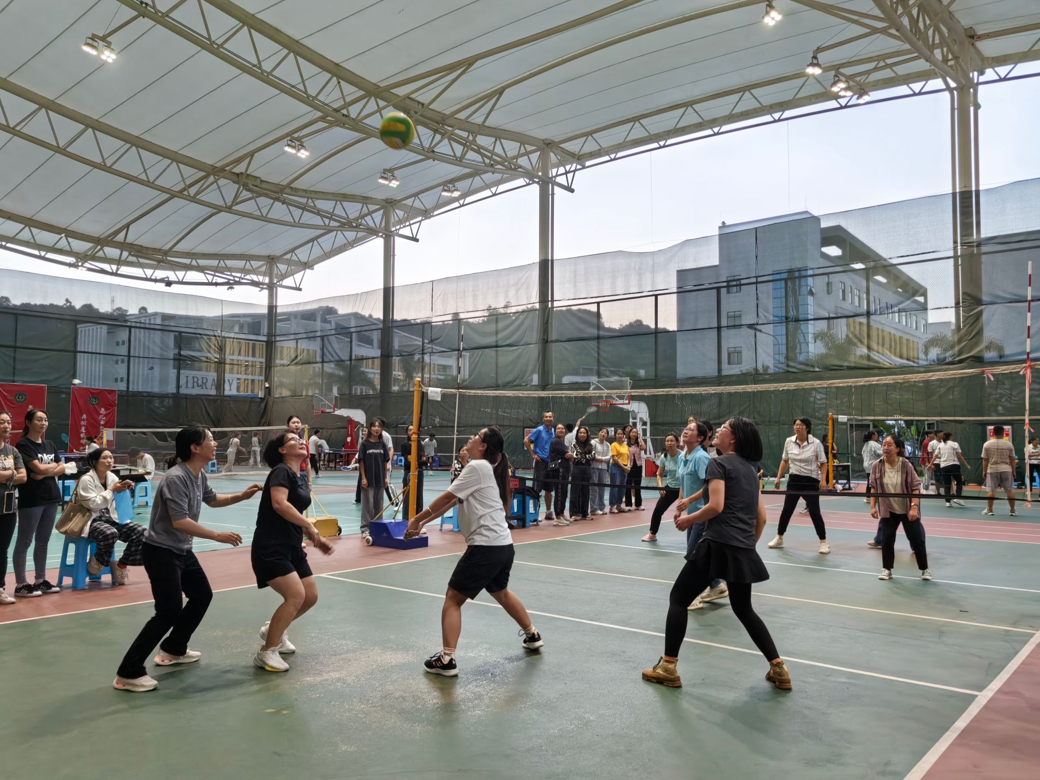 比赛中最为激烈的当数排球,教职工们精神抖擞,配合默契,发球、传球、扣球、拦网,动作行云流水,一气呵成,他们的身姿矫健而灵活,就像一只只展翅飞翔的雄鹰,在网球球场上空翻腾、跳跃。