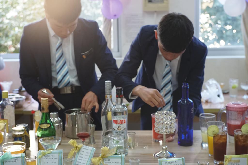 酒店管理与数字化运营专业员工在酒吧实训室进行鸡尾酒调制训练